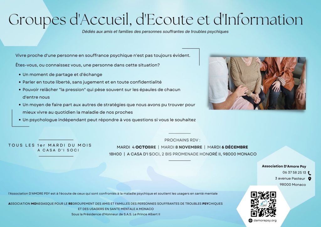C’est donc avec grand plaisir que nous vous annonçons la reprise des » Groupes d’Accueil d’Ecoute et d’Information » tous les 1er Mardi du mois à compter du Mardi 06 septembre 2022 à 18h à la CASA DI SOCCI, 2 bis Prom. Honoré II, 98000 Monaco, et sur une période de 4 mois.